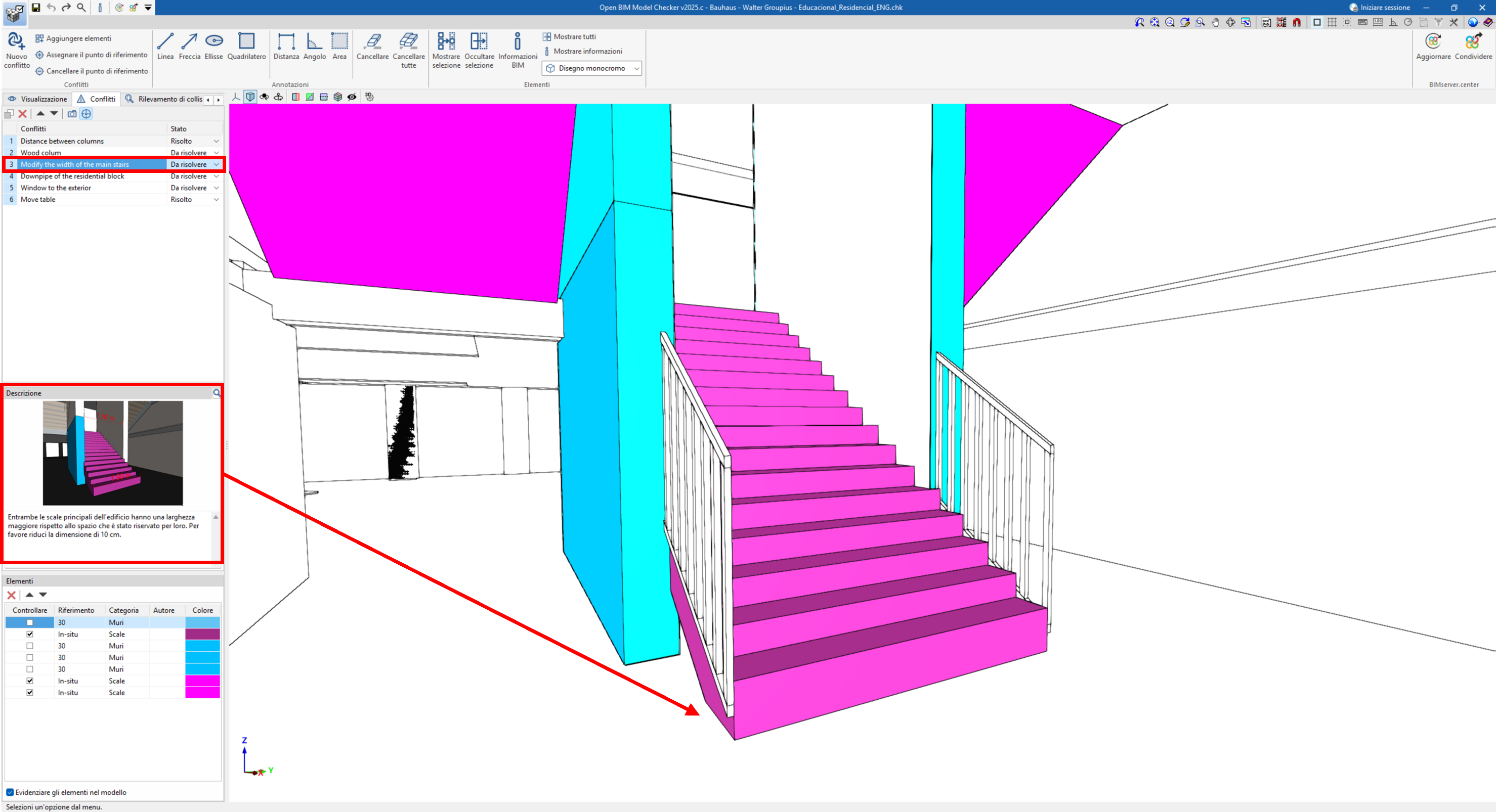 Selezionando un’interferenza nell’elenco, il programma evidenzia automaticamente la posizione del conflitto nel modello 3D.
