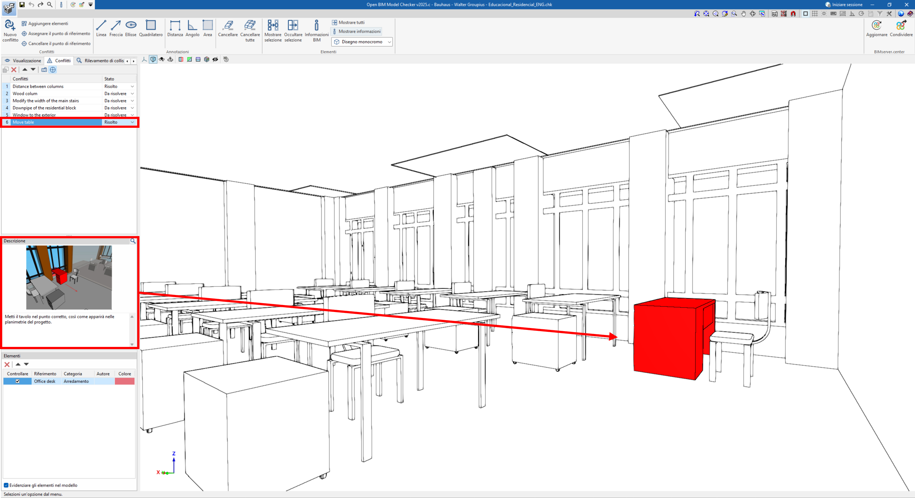 Selezionando un’interferenza nell’elenco, il programma evidenzia automaticamente la posizione del conflitto nel modello 3D.