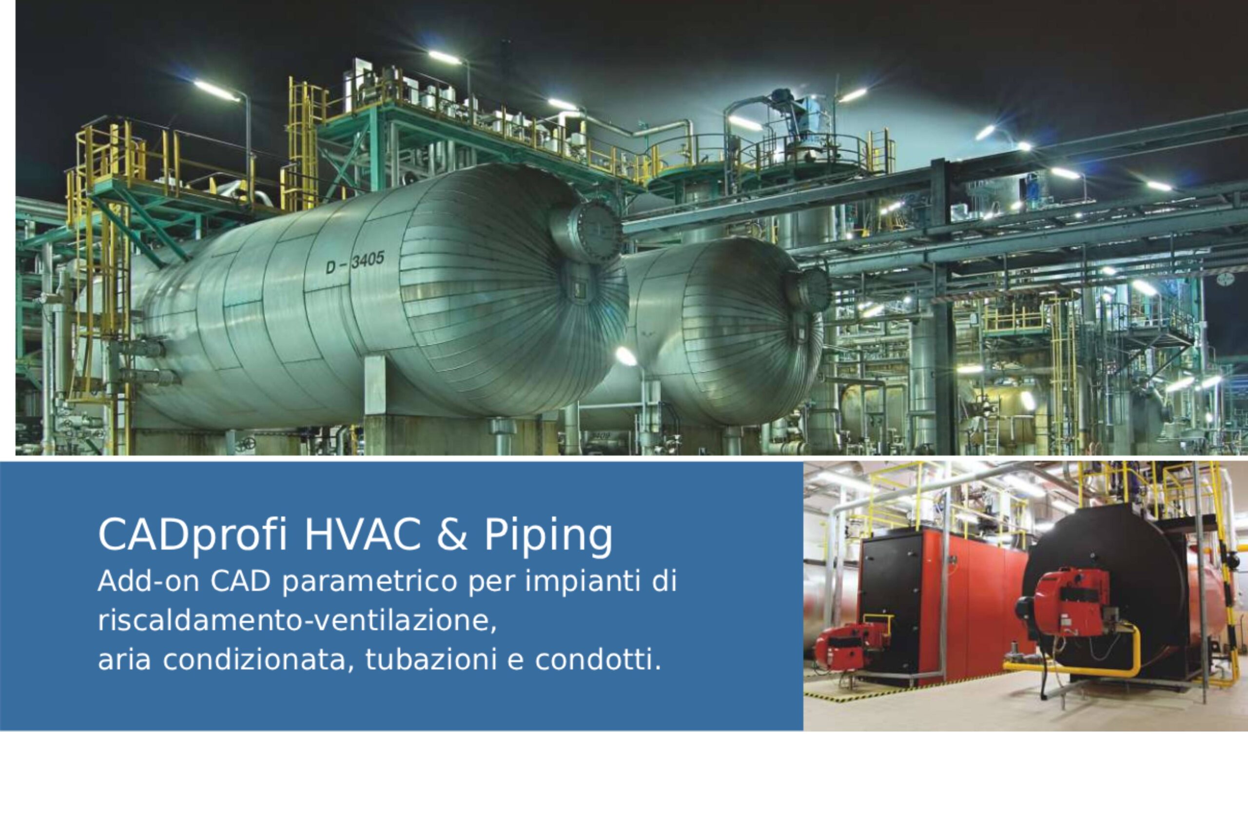 Modulo CAD per la progettazione di impianti tecnici del tipo riscaldamento-ventilazione, aria condizionata, tubazioni e condotti.