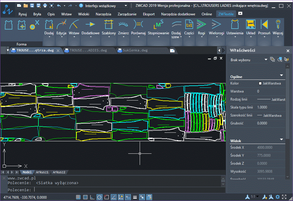 Il modulo layout di taglio include la possibilità di creare il layout e quindi disporre gli elementi utilizzando strumenti di supporto dedicati. Altre funzionalità includono la creazione delle varie taglie in automatico. Un modulo aggiuntivo è la costruzione dinamica delle griglie. Creazione di una base di griglie di costruzione già pronte con parametri dinamici per la modifica. Il modulo di importazione include la possibilità di caricare file DXF con un file RUL che definisce le regole di valutazione dei moduli da altre soluzioni del settore.